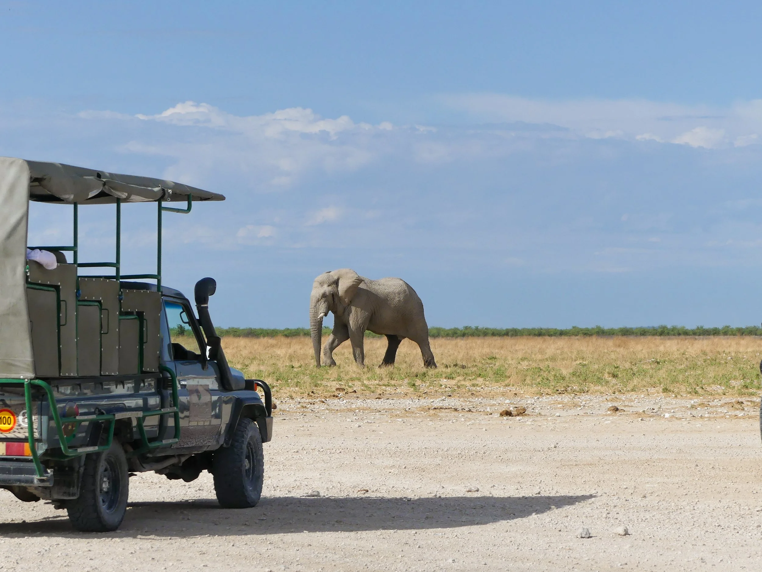 Etosha is often the highlight of a Namibia trip, and it’s easy to see why. The park stretches over 22,000 km² of flat salt pans, savannah and scrubland, giving a sense of space that feels almost endless. Wildlife here is abundant and varied, from elephants and giraffes to lions, springboks and rare black rhinos. Spotting them while driving through the park on your own is part of what makes Etosha so special.