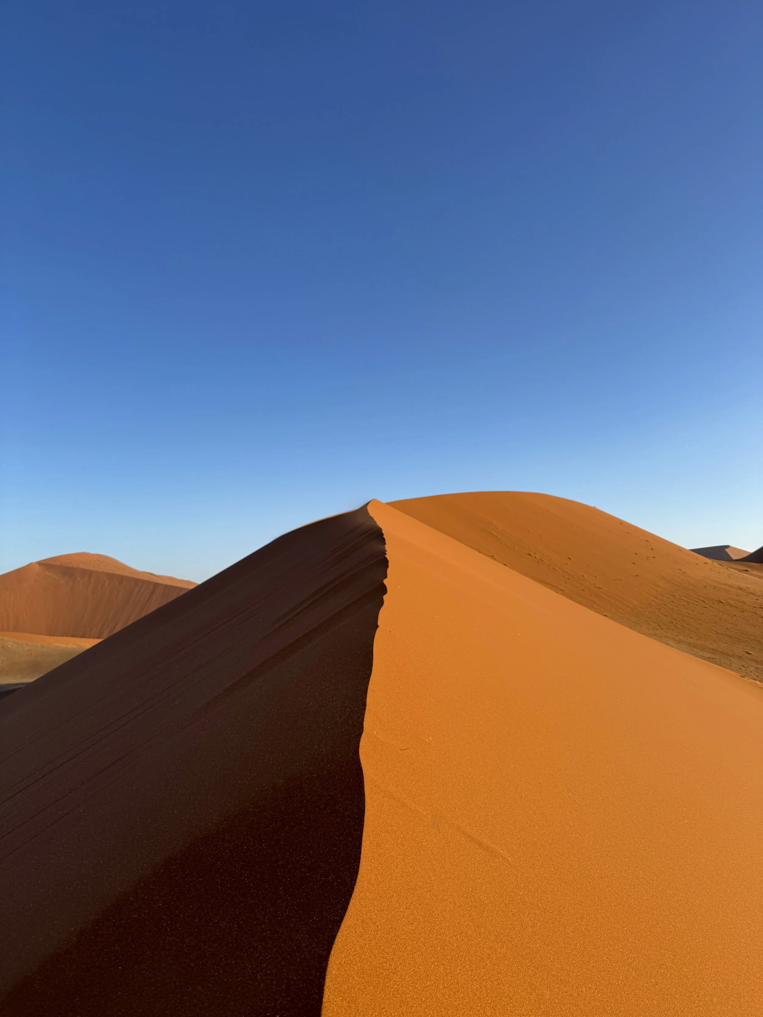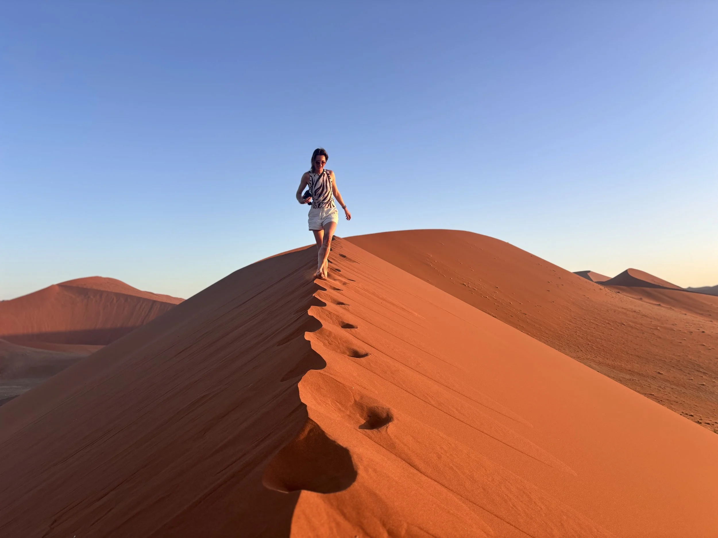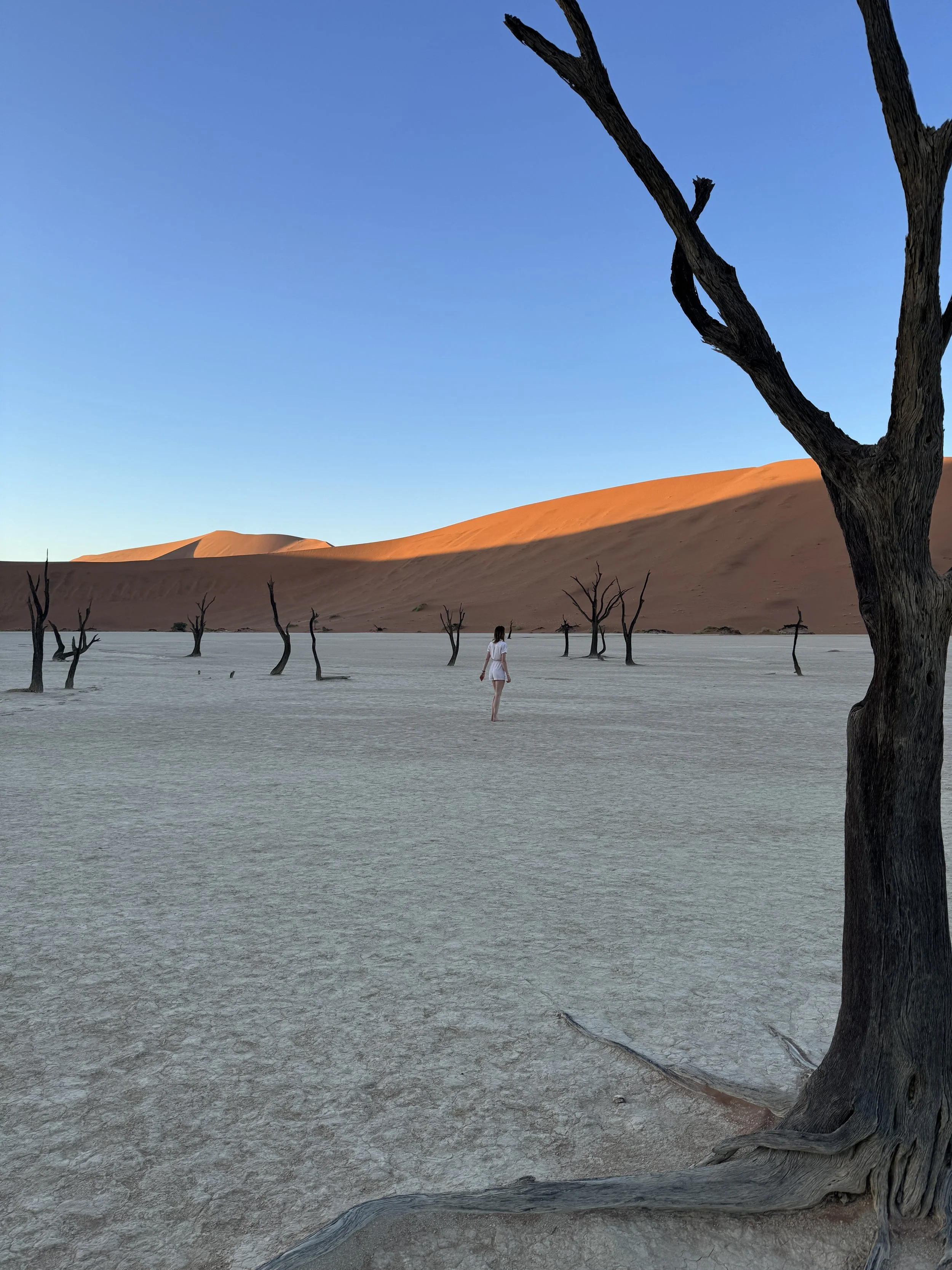 Sunrise and sunset are when the landscape feels most alive. Climbing a dune as the light slowly changes reveals endless layers of sand and shadow. Early mornings are best spent in Deadvlei, where the contrast between white clay, dark trees, blue skies and orange dunes creates one of Namibia’s most iconic scenes. As the day heats up, the desert sets the pace again, inviting slower moments and breaks from the sun.